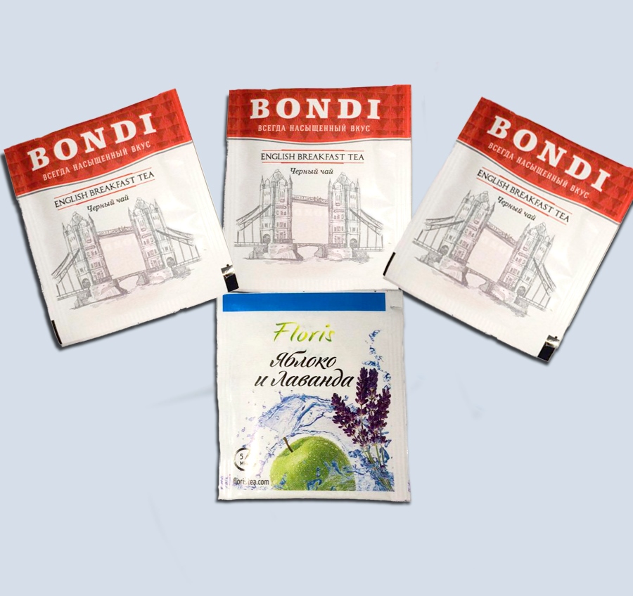 Индивидуальный саше-конверт может быть изготовлен как из комбинированного материала типа «Триплекс» (на фото), так и из ламинированной бумаги. Второй вариант безусловно дешевле. Подобная упаковка формирует для пакетика премиальный и презентабельный вид, хорошо сохраняет аромат чая и не позволяет мелким частицам содержимого высыпаться под пленку готовой коробочки.